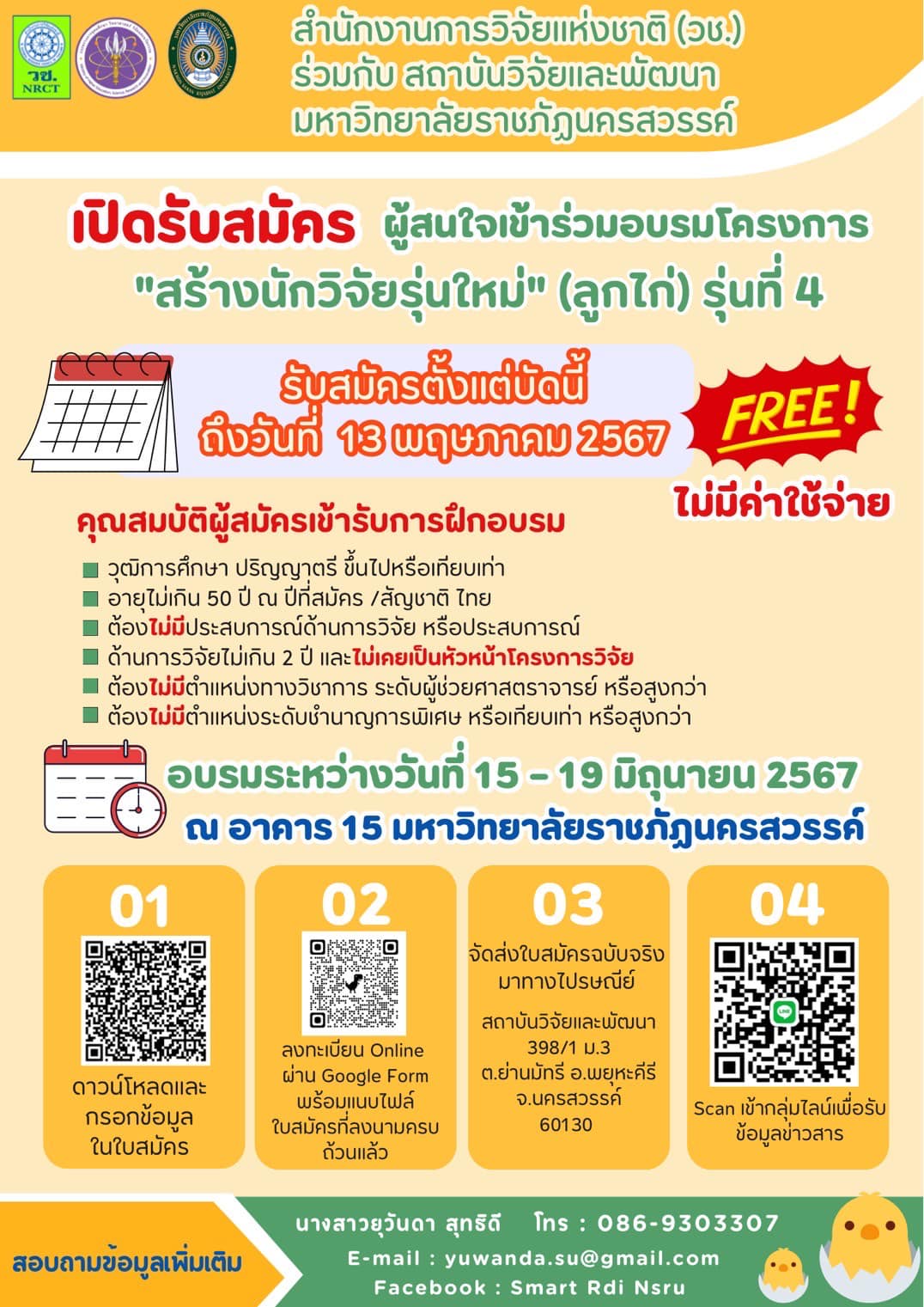 สำนักงานการวิจัยแห่งชาติ (วช.) กระทรวงการอุดมศึกษา วิทยาศาสตร์ วิจัยและนวัตกรรม ร่วมกับ สถาบันวิจัยและพัฒนา มหาวิทยาลัยราชภัฏนครสวรรค์ ขอประชาสัมพันธ์เชิญชวนผู้สนใจเข้าร่วมฝึกอบรมโครงการ “สร้างนักวิจัยรุ่นใหม่” (ลูกไก่) รุ่นที่ 4 จัดอบรมระหว่างวันที่ 15 – 19 มิถุนายน 2567 ณ อาคาร 15 มหาวิทยาลัยราชภัฏนครสวรรค์ รับสมัครตั้งแต่บัดนี้ ถึง 13 พฤษภาคม 2567 (หรือจนกว่าจะครบตามจำนวน) ฟรีไม่มีค่าใช้จ่าย