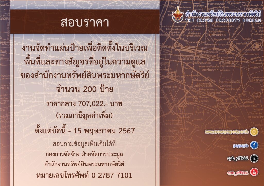 สำนักงานทรัพย์สินพระมหากษัตริย์ เปิดสอบราคางานจัดทำแผ่นป้าย จำนวน 200 ป้าย