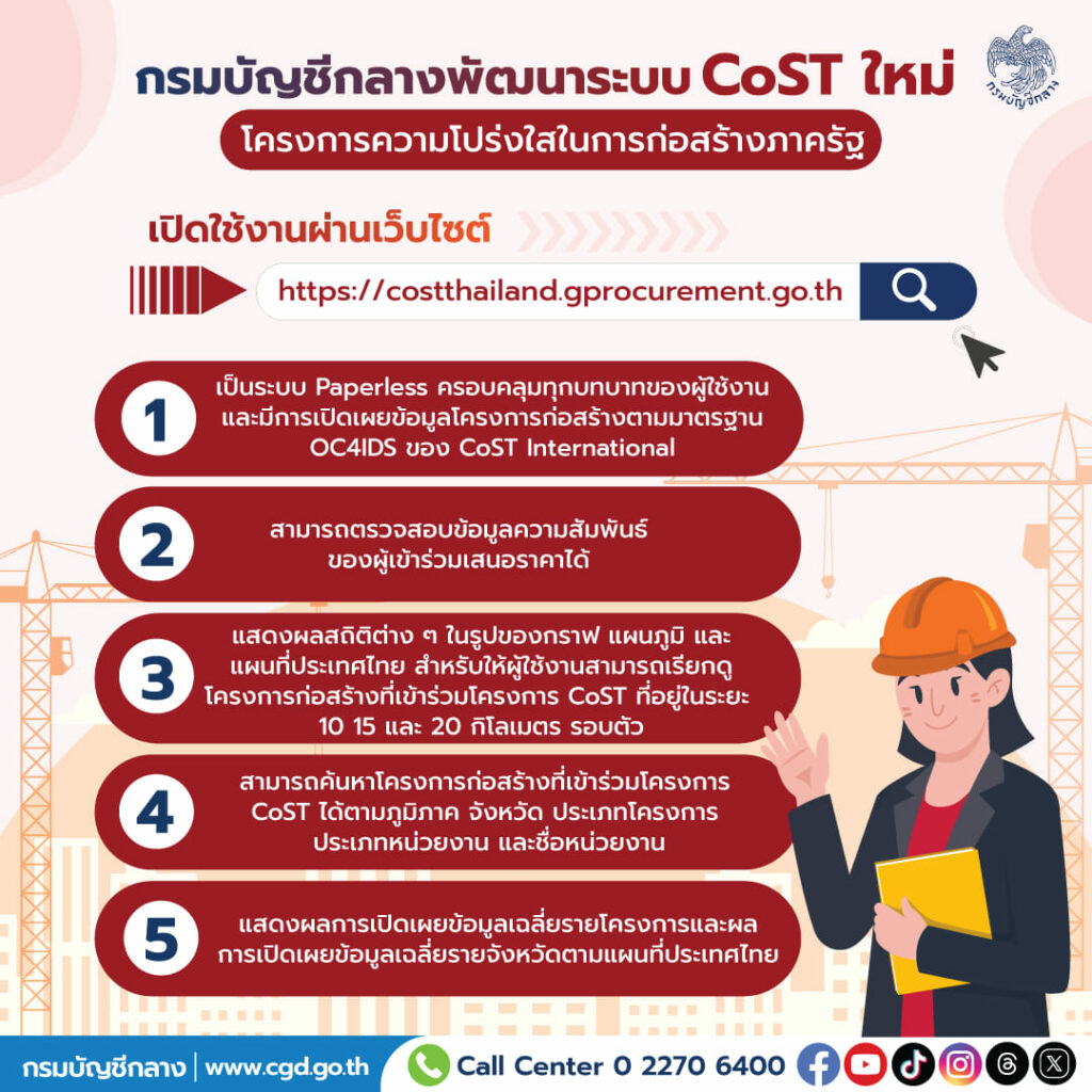 นางแพตริเซีย มงคลวนิช อธิบดีกรมบัญชีกลาง เปิดเผยว่า กรมบัญชีกลางได้พัฒนาระบบโครงการความโปร่งใสในการก่อสร้างภาครัฐ (CoST) ใหม่ ผ่านเว็บไซต์ https://costthailand.gprocurement.go.th เพื่อรองรับการดำเนินงานตามประกาศคณะกรรมการความร่วมมือป้องกันการทุจริต โดยเว็บไซต์ CoST ใหม่ ได้เปิดใช้งานตั้งแต่วันที่ 2 พฤษภาคม 2567 เป็นต้นไป ซึ่งเว็บไซต์ดังกล่าวเป็นระบบ Paperless ครอบคลุมทุกบทบาทของผู้ใช้งานและมีการเปิดเผยข้อมูลโครงการก่อสร้างตามมาตรฐาน OC4IDS ของ CoST International ในรูปแบบของ json file เพื่อให้นักพัฒนาระบบสามารถนำข้อมูลไปวิเคราะห์ต่อยอด และตรวจสอบข้อมูลความสัมพันธ์ของผู้เข้าร่วมเสนอราคาได้ และมีการแสดงผลสถิติต่าง ๆ ในรูปของกราฟ แผนภูมิ และแผนที่ประเทศไทย สำหรับให้ผู้ใช้งานเรียกดูโครงการก่อสร้างที่เข้าร่วมโครงการ CoST ที่อยู่ในระยะ 10 15 และ 20 กิโลเมตรรอบตัว ตลอดจนสามารถค้นหาโครงการก่อสร้างที่เข้าร่วมโครงการ CoST ได้ตามภูมิภาค จังหวัด ประเภทโครงการ ประเภทหน่วยงาน และชื่อหน่วยงาน และแสดงผลระดับร้อยละการเปิดเผยข้อมูลเฉลี่ยตามจังหวัดในแผนที่ประเทศไทยได้ ซึ่งเว็บไซต์ CoST ใหม่ จะอำนวยความสะดวกให้กับภาคประชาชนในการติดตามข้อมูลโครงการก่อสร้างที่เข้าร่วมโครงการ CoST ได้มากยิ่งขึ้น