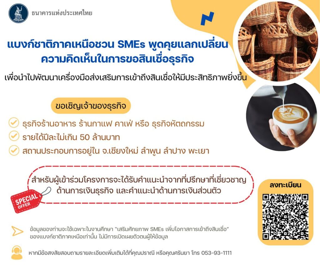 ธนาคารแห่งประเทศไทย ภาคเหนือ ชวน SMEs พูดคุยแลกเปลี่ยนความคิดเห็นในการขอสินเชื่อธุรกิจ เพื่อนำไปพัฒนาเครื่องมือส่งเสริมการเข้าถึงสินเชื่อให้มีประสิทธิภาพยิ่งขึ้น โดยขอเชิญเจ้าของธุรกิจ ธุรกิจร้านอาหาร กาแฟ หรือธุรกิจงานหัตถกรรม ในพื้นที่ เชียงใหม่ ลำพูน ลำปาง และพะเยา และรายได้ต่อปีไม่เกิน 50 ล้านบาท ขอรับคำแนะนำจากที่ปรึกษาด้านการเงินธุรกิจและการเงินส่วนตัว และของที่ระลึกบัตรเข้าชมอุทยานหลวงราชพฤกษ์ จังหวัดเชียงใหม่ ลงทะเบียนได้ที่ https://app.bot.or.th/BOTSurvey/SurveyResponse?SurveyID=ueZJIHXXLjlwt9lO64U9rw==