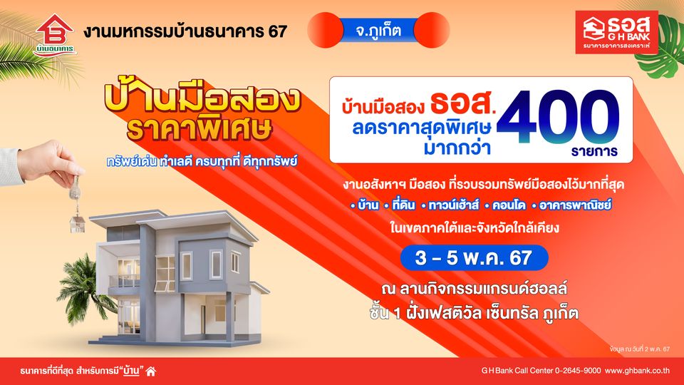 ธอส. จัดงานมหกรรมบ้านธนาคาร ในวันที่ 3 – 5 พ.ค. 67 ณ จังหวัดภูเก็ต