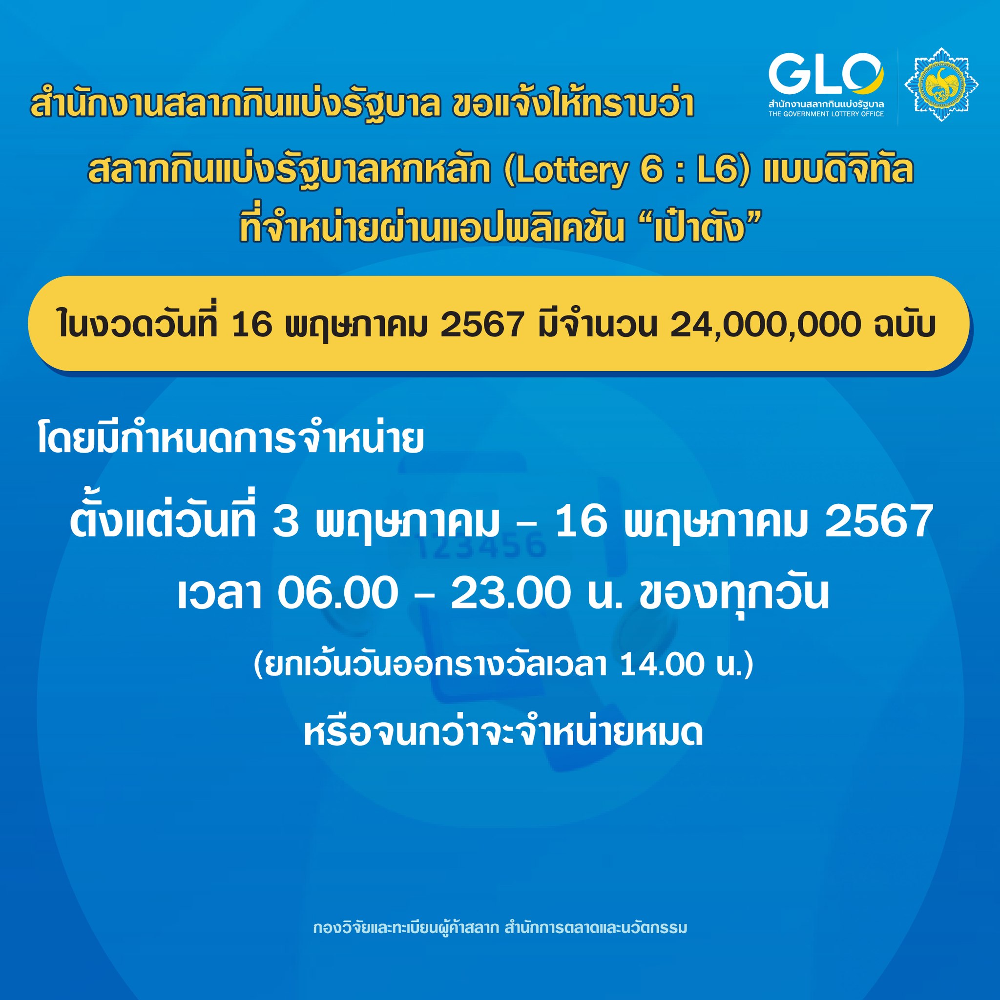 สำนักงานสลากฯ แจ้งสลากกินแบ่งรัฐบาลหกหลัก (L6) ที่จำหน่ายผ่านแอป “เป๋าตัง” งวดวันที่ 16 พ.ค. 67 มีจำนวน 24,000,000 ฉบับ ข่าวสารกิจกรรม สำนักงานสลากฯ แจ้งสลากกินแบ่งรัฐบาลหกหลัก (L6) ที่จำหน่ายผ่านแอป “เป๋าตัง” งวดวันที่ 16 พ.ค. 67 มีจำนวน 24,000,000 ฉบับ สำนักงานสลากกินแบ่งรัฐบาล แจ้งสลากกินแบ่งรัฐบาลหกหลัก (Lottery 6 : L6) แบบดิจิทัล ที่จำหน่ายผ่านแอปพลิเคชัน “เป๋าตัง” ในงวดวันที่ 16 พฤษภาคม 2567 มีจำนวน 24,000,000 ฉบับ โดยมีกำหนดจำหน่าย ตั้งแต่วันที่ 3 – 16 พฤษภาคม 2567 ตั้งแต่เวลา 06.00 – 23.00 น. ของทุกวัน ยกเว้นวันออกรางวัลเวลา 14.00 น. หรือจนกว่าจะจำหน่ายหมด ที่มา : https://citly.me/TnyzJ Post Views: 32 FacebookFacebookXTwitterLINELine