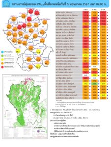 ศูนย์แก้ไขปัญหามลพิษทางอากาศ รายงานการติดตามตรวจสอบคุณภาพอากาศ ประจำวันที่ 5 พฤษภาคม 2567 เวลา 07.00 น. สรุปดังนี้