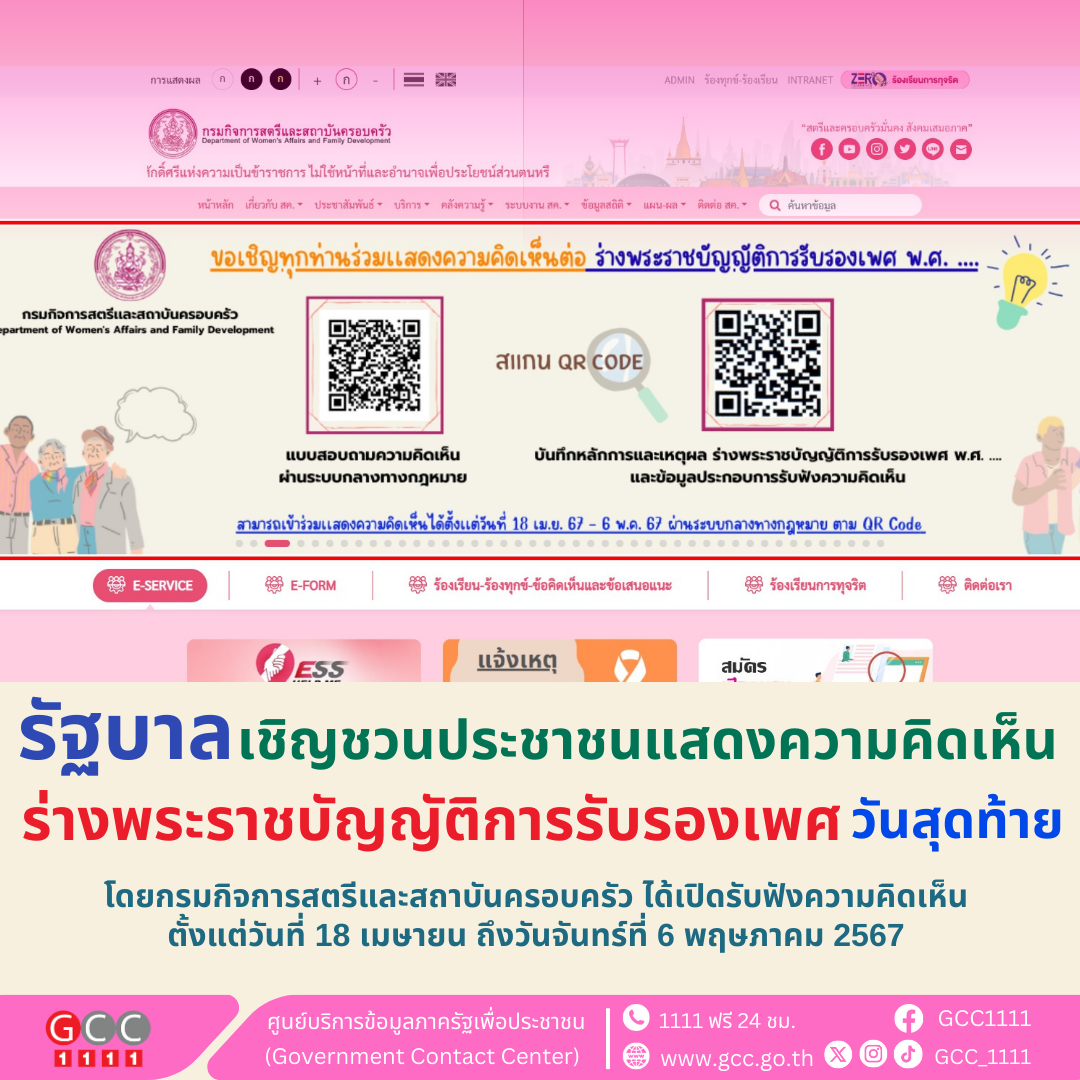 วันนี้ (6 พฤษภาคม 2567) นางรัดเกล้า อินทวงศ์ สุวรรณคีรี รองโฆษกสำนักนายกรัฐมนตรีออกมาเชิญชวนประชาชน ร่วมแสดงความคิดเห็นต่อร่างพระราชบัญญัติการรับรองเพศ พ.ศ…. โดยกรมกิจการสตรีและสถาบันครอบครัวกระทรวงการพัฒนาสังคมและความมั่นคงของมนุษย์ได้เปิดรับฟังความคิดเห็นตั้งแต่วันที่ 18 เมษายนโดยจะสิ้นสุดในวันนี้ วันจันทร์ที่ 6 พฤษภาคม พ.ศ. 2567
