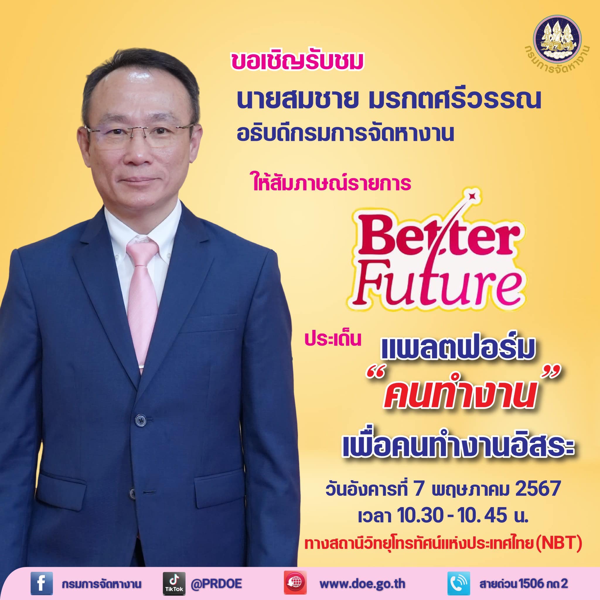 กรมการจัดหางาน จัดรายการ Better Future ประเด็น แพลตฟอร์ม “คนทำงาน” เพื่อคนทำงานอิสระ วันที่ 7 พฤษภาคม 2567 เวลา 10.30 – 10.45 น. ทางสถานีวิทยุโทรทัศน์แห่งประเทศไทย (NBT) ให้สัมภาษณ์โดย นายสมชาย มรกตศรีวรรณ อธิบดีกรมการจัดหางาน