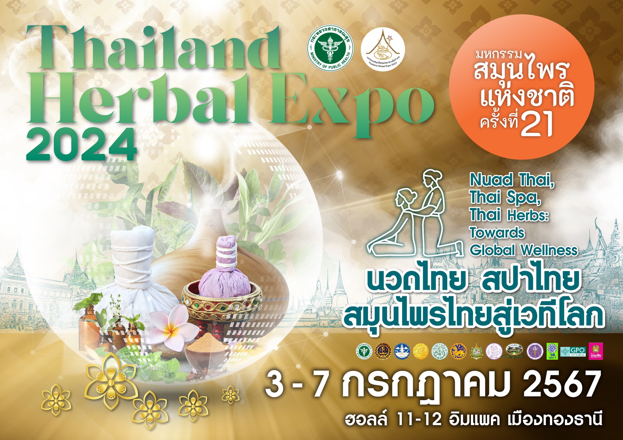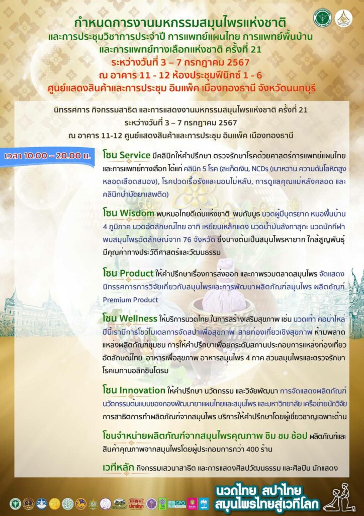 กรมการแพทย์แผนไทยและการแพทย์ทางเลือก จัดมหกรรมสมุนไพรแห่งชาติ ครั้งที่ 21 (Thailand Herbal Expo 2024) วันที่ 3 – 7 กรกฏาคม 2567 ณ ฮอลล์ 11 – 12 อิมแพค เมืองทองธานี