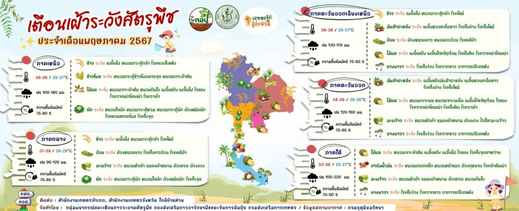กรมส่งเสริมการเกษตร แจ้งเตือนเกษตรกรทุกภูมิภาค เฝ้าระวังศัตรูพืช ประจำเดือน พฤษภาคม 2567 ข่าวสารกิจกรรม กรมส่งเสริมการเกษตร แจ้งเตือนเกษตรกรทุกภูมิภาค เฝ้าระวังศัตรูพืช ประจำเดือน พฤษภาคม 2567 กรมส่งเสริมการเกษตร เตือนเกษตรกรหมั่นสำรวจแปลงเพาะปลูก โดยเฉพาะผู้ปลูกข้าวโพด ข้าว มันสำปะหลัง และทุเรียน หากเกษตรกรพบว่า ต้นพืชมีอาการผิดปกติดังกล่าว ควรเร่งหาสาเหตุและวิธีป้องกันกำจัดศัตรูพืชที่พบทันที เพื่อป้องกันผลกระทบที่อาจเกิดขึ้น สอบถามรายละเอียดเพิ่มเติมได้ที่ สำนักงานเกษตรอำเภอ สำนักงานเกษตรจังหวัด ใกล้บ้าน ที่มา : https://citly.me/WGlU7 Post Views: 14 FacebookFacebookXTwitterLINELine