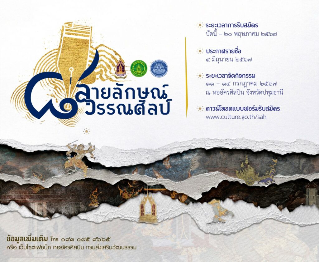 กรมส่งเสริมวัฒนธรรม เชิญร่วมอบรม โครงการถ่ายทอดงานศิลป์กับศิลปินแห่งชาติ ลายลักษณ์วรรณศิลป์ รุ่น 8 ระหว่างวันที่ 11 – 14 กรกฎาคม 2567 ณ หออัครศิลปิน จังหวัดปทุมธานี ฟรี โดยไม่เสียค่าใช้จ่าย