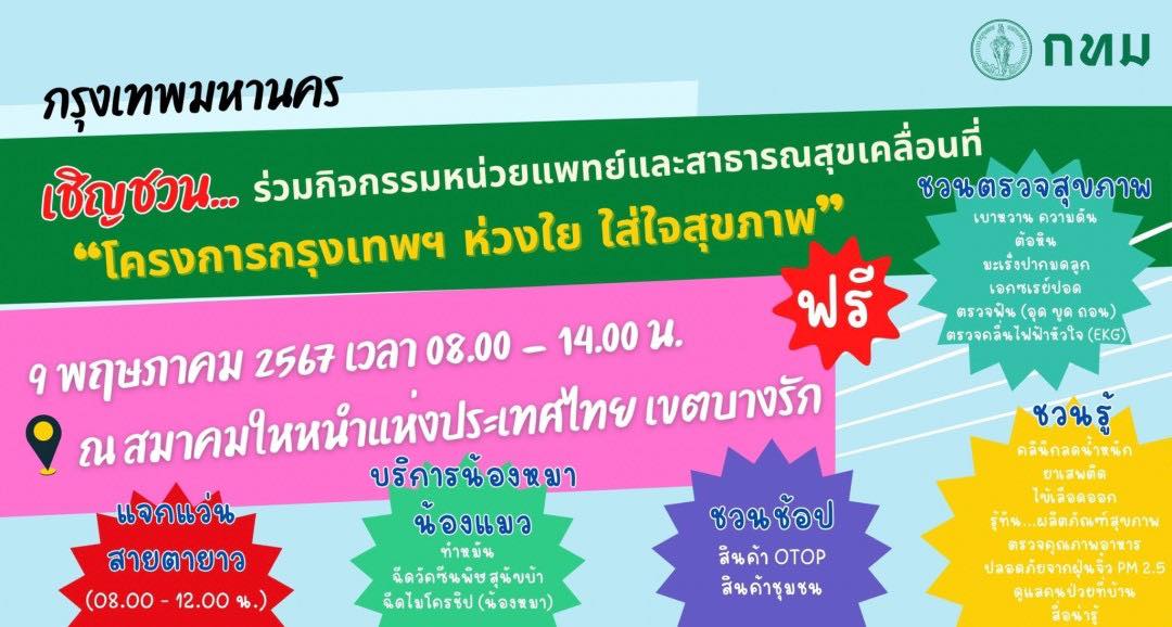 กรุงเทพมหานคร เชิญชวนร่วมกิจกรรมหน่วยแพทย์และสาธารณสุขเคลื่อนที่ฟรี ภายใต้ “โครงการกรุงเทพฯ ห่วงใย ใส่ใจคุณภาพ” ในวันที่ 9 พฤษภาคม 2567 ตั้งแต่เวลา 08.00 – 14.00 น. ณ สมาคมใหหนำแห่งประเทศไทย เขตบางรัก