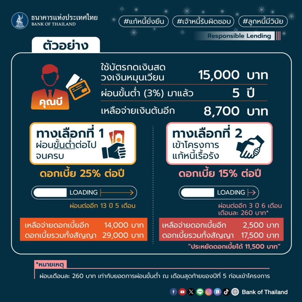 ทั้งนี้ อยากหมดหนี้ไว จ่ายดอกเบี้ยลดลง ภาระต่อเดือนไม่เพิ่มจากเดิม เลือกเข้ามาตรการปิดจบหนี้เรื้อรังได้ตั้งแต่บัดนี้เป็นต้นไป โดยลูกหนี้ที่เข้าข่ายเป็นหนี้เรื้อรัง จะได้รับการติดต่อจากเจ้าหนี้ หากในช่วง 5 ปีที่ผ่านมา ลูกหนี้ได้จ่ายดอกเบี้ยรวมมากกว่าเงินต้นรวม จะได้รับข้อเสนอปิดจบ 5 ปี ดอกเบี้ย 15% ศึกษารายละเอียดเพิ่มเติมที่ https://www.bot.or.th/debtsolution