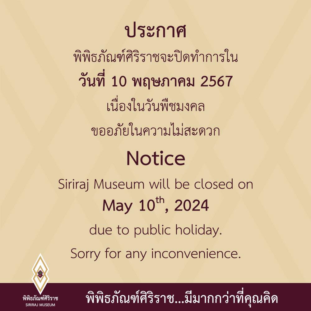 พิพิธภัณฑ์ศิริราช แจ้งปิดทำการ วันที่ 10 พฤษภาคม 2567 เนื่องในวันพืชมงคล
