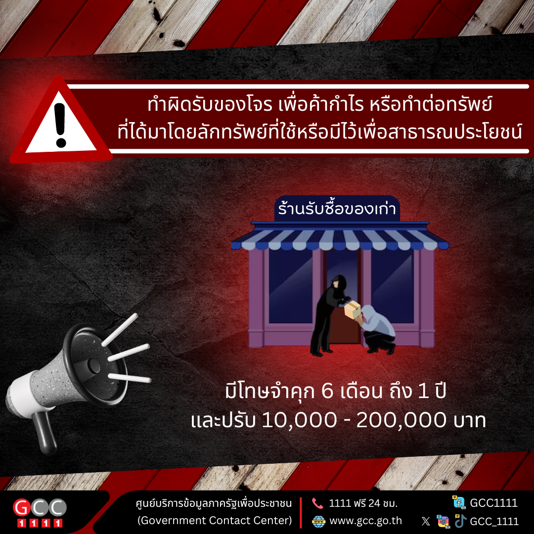สำนักงานกิจการยุติธรรม แจ้งเตือนทำผิดรับของโจร เพื่อค้ากำไร หรือทำต่อทรัพย์ ที่ได้มาโดยลักทรัพย์ ที่ใช้หรือมีไว้เพื่อสาธารณประโยชน์ มีโทษจำคุก 6 เดือน ถึง 1 ปี และปรับ 10,000 – 200,000 บาท ทั้งนี้ การรับของโจร = เอาต่อจากคนอื่น คือการช่วยซ่อนเร้น ช่วยจำหน่ายช่วยพา/นำไป ซื้อ รับจำนำ รับทรัพย์ไว้