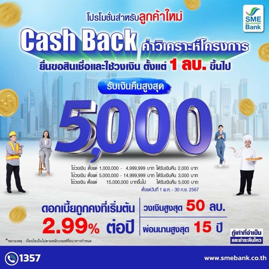 SME D Bank แนะนำโปรโมชั่นสำหรับลูกค้าใหม่ ดอกเบี้ยเริ่มต้น 2.99%ต่อปี ข่าวสารกิจกรรม SME D Bank แนะนำโปรโมชั่นสำหรับลูกค้าใหม่ ดอกเบี้ยเริ่มต้น 2.99%ต่อปี ธนาคารพัฒนาวิสาหกิจขนาดกลางและขนาดย่อมแห่งประเทศไทย แนะนำโปรโมชั่นสำหรับลูกค้าใหม่ ตั้งแต่บัดนี้ – 30 กันยายน 2567 สินเชื่อดอกเบี้ยพิเศษเริ่มต้น 2.99%ต่อปี วงเงินกู้สูงสุด 50 ล้านบาท ผ่อนนานสูงสุด 15 ปี เมื่อยื่นกู้สินเชื่อและใช้วงเงิน ตั้งแต่ 1 ล้านบาท ขึ้นไป รับเงินคืน (Cash Back) ค่าวิเคราะห์โครงการ มูลค่าสูงสุด 5,000 บาท สอบถามข้อมูลเพิ่มเติมที่ ฝ่ายส่งเสริมการตลาด Call Center 1357 ที่มา : https://citly.me/XMdQS Post Views: 20 FacebookFacebookXTwitterLINELine