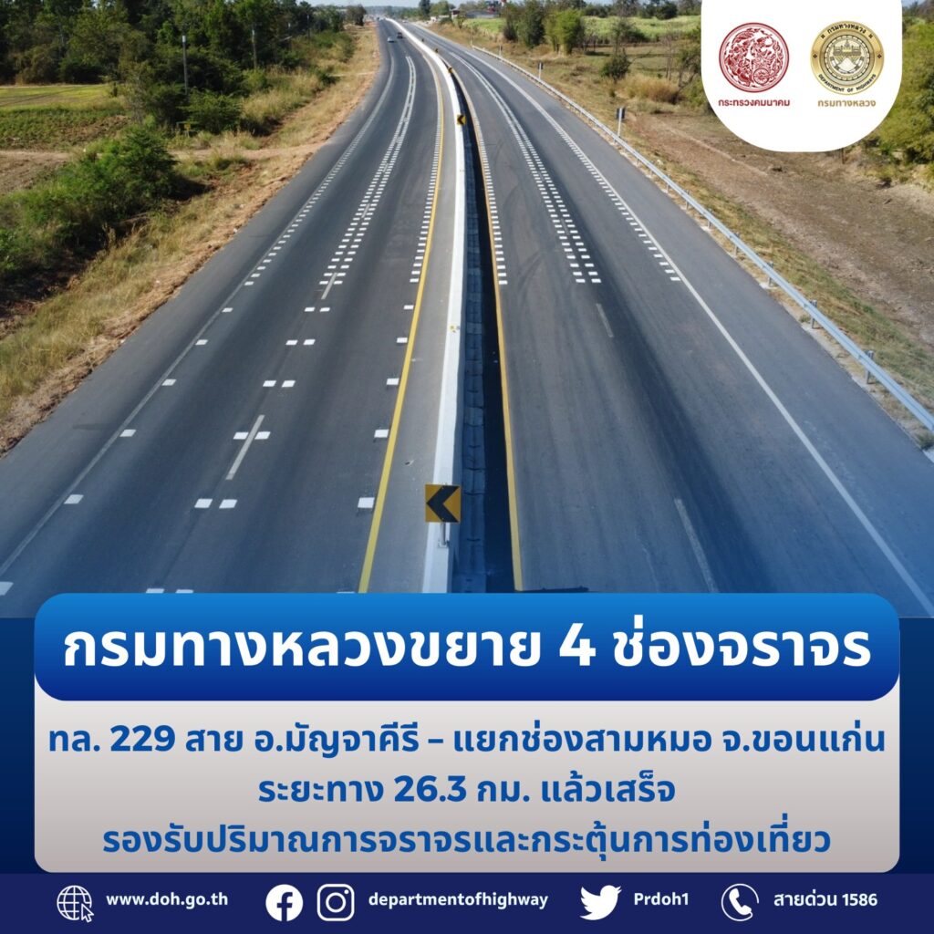 นายสราวุธ ทรงศิวิไล อธิบดีกรมทางหลวง กระทรวงคมนาคม เปิดเผยว่า กรมทางหลวง (ทล.) โดยสำนักก่อสร้างทางหลวงที่ 2 ได้ก่อสร้าง ทล.229 สาย อำเภอมัญจาคีรี – แยกช่องสามหมอ จังหวัดขอนแก่น เป็น 4 ช่องจราจร ระยะทาง 26.335 กิโลเมตร แล้วเสร็จ เพื่อรองรับปริมาณการจราจรในอนาคต เพิ่มประสิทธิภาพโครงข่ายการคมนาคมขนส่งของภาคตะวันออกเฉียงเหนือ