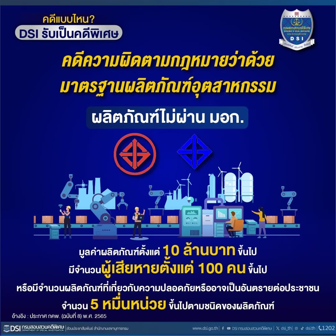 กรมสอบสวนคดีพิเศษ แนะนำคดีความผิดตามกฎหมายว่าด้วย มาตรฐานผลิตภัณฑ์อุตสาหกรรม ผลิตภัณฑ์ ไม่ผ่าน มอก. โดยมูลค่าผลิตภัณฑ์ตั้งแต่ 10 ล้านบาท ขึ้นไป มีจำนวนผู้เสียหายตั้งแต่ 100 คน ขึ้นไป หรือมีจำนวนผลิตภัณฑ์ที่เกี่ยวกับความปลอดภัยหรืออาจเป็นอันตรายต่อประชาชน จำนวน 5 หมื่นหน่วย ขึ้นไปตามชนิดของผลิตภัณฑ์