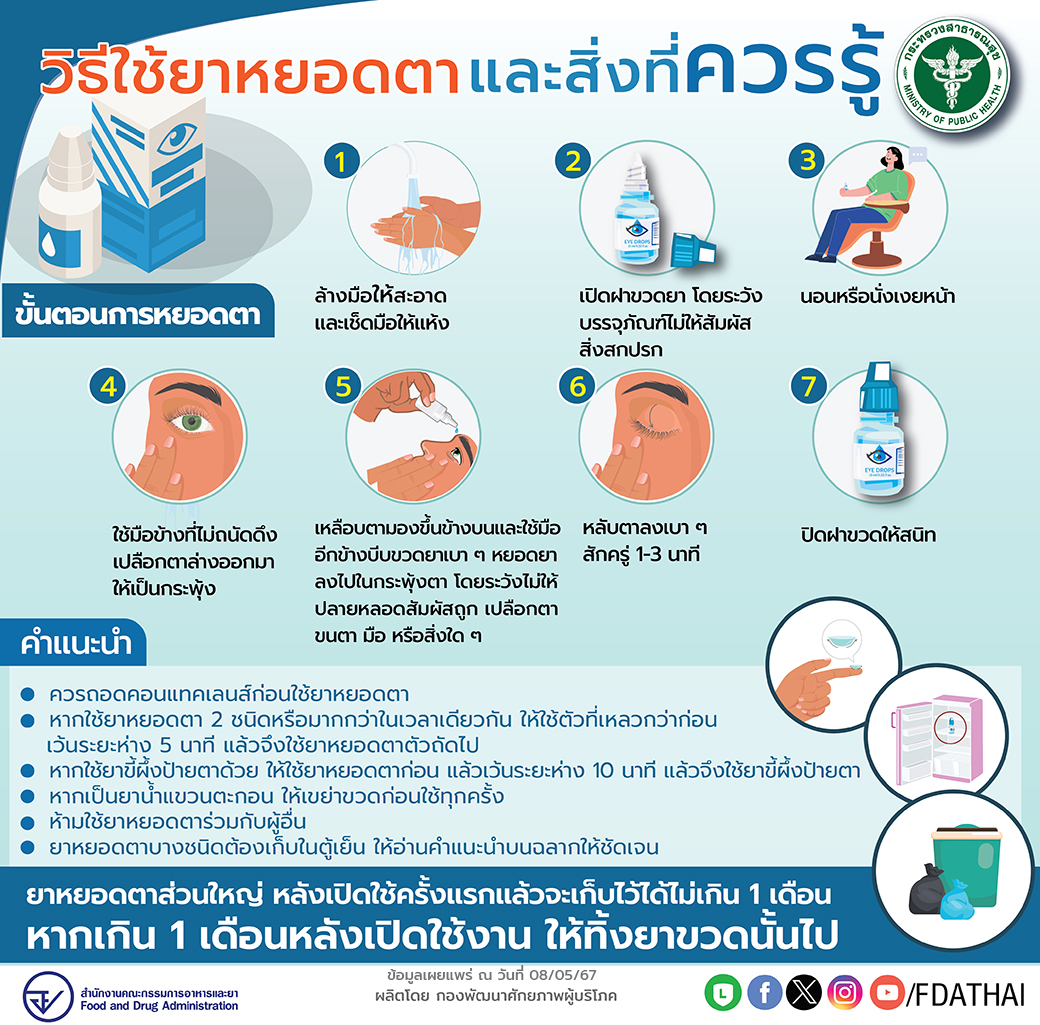 สำนักงานคณะกรรมการอาหารและยา แนะนำวิธีใช้ยาหยอดตาและสิ่งที่ควรรู้ โดยยาหยอดตาถือเป็นสิ่งที่ใครหลายคนต้องพกติดตัวและใช้อยู่เป็นประจำ ซึ่งยาหยอดตานั้นมีหลายรูปแบบ เช่น ชนิดน้ำขุ่น ชนิดน้ำใส ชนิดเจล หรือชนิดที่เป็นขี้ผึ้งสำหรับป้ายตา บางครั้งมีความจำเป็นต้องใช้ยาหยอดตาหลายชนิดร่วมกัน