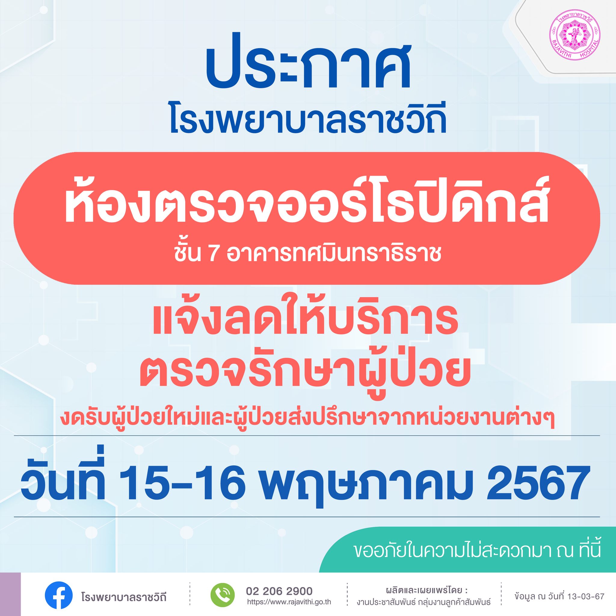โรงพยาบาลราชวิถี กรมการแพทย์ ประกาศแจ้ง ห้องตรวจออร์โธปิดิกส์ ลดให้บริการตรวจรักษาผู้ป่วย (งดรับผู้ป่วยใหม่และผู้ป่วยส่งปรึกษาจากหน่วยงานต่างๆ) ในวันที่ 15 – 16 พฤษภาคม 2567 ณ ชั้น 7 อาคารทศมินทราธิราช