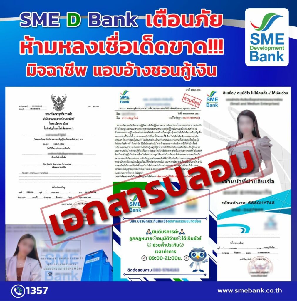 ธนาคารพัฒนาวิสาหกิจขนาดกลางและขนาดย่อมแห่งประเทศไทย ขอแจ้งเตือนผู้ประกอบการเอสเอ็มอี เนื่องจากขณะนี้ มีมิจฉาชีพ แอบอ้างใช้ภาพโลโก้ของ “SME D Bank” รวมถึง ปลอมเอกสาร พร้อมแอบอ้างเป็นเจ้าหน้าที่ เพื่อขักชวนให้กู้เงิน จึงขอเรียนชี้แจ้งว่าธนาคารไม่มีส่วนเกี่ยวข้องใดๆ ทั้งสิ้นกับเอกสารและการให้บริการกู้เงินดังกล่าว และธนาคารไม่มีนโยบายให้บุคคลภายนอก แอบอ้างนำชื่อ โลโก้ หรือสิ่งอื่นใดที่สื่อให้เข้าใจว่าเป็นบริการจาก SME D Bank ไปหาผลประโยชน์ สอบถามข้อมูลเพิ่มเติมที่ Call Center 1357