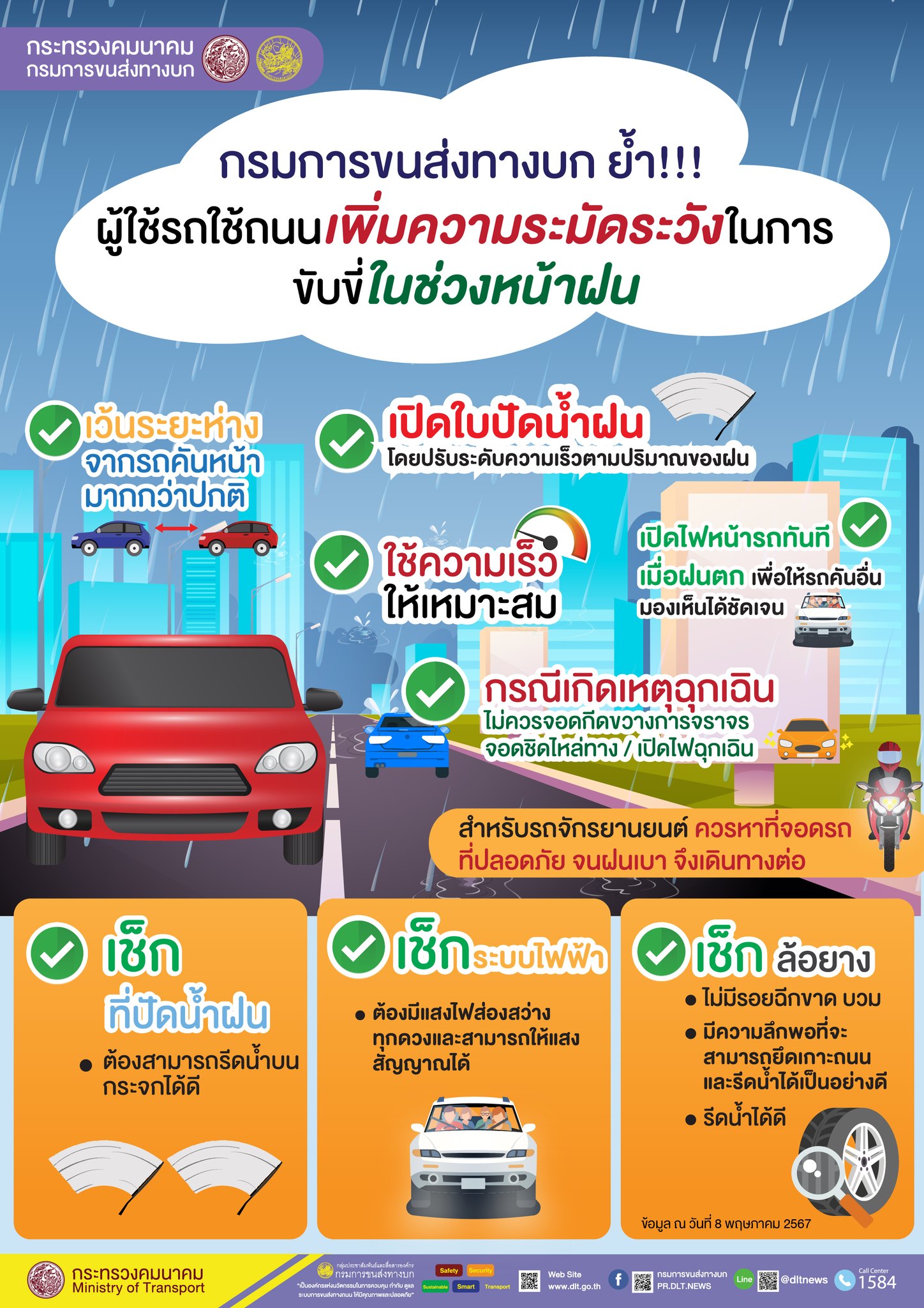กรมการขนส่งทางบก ย้ำผู้ใช้รถใช้ถนนเพิ่มความระมัดระวังในการขับขี่ในช่วงหน้าฝน แนะนำให้ผู้ขับขี่หมั่นตรวจสอบความพร้อมของรถก่อนออกเดินทางช่วงหน้าฝน