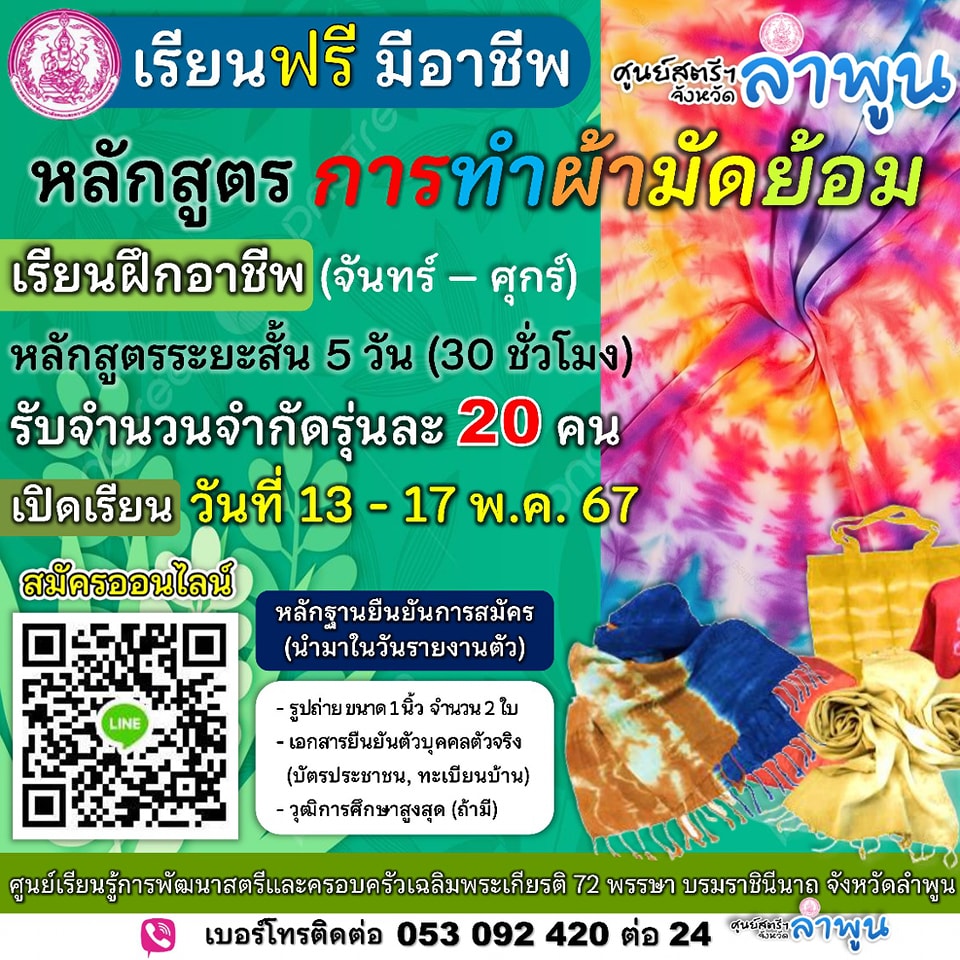 กรมกิจการสตรีและสถาบันครอบครัว จัดหลักสูตร การทำผ้ามัดย้อม (หลักสูตรระยะสั้น 5 วัน (ระยะสั้น 5 วัน : 30 ชั่วโมง)) วันที่ 13 – 17 พฤษภาคม 2567 (วันจันทร์ – ศุกร์) ผู้ที่สนใจสามารถกรอกสมัครฝึกอาชีพออนไลน์ เปิดรับจำนวน 20 คน ได้ทางเว็บไซต์ https://line.me/R/ti/g/HrHSllU-R4