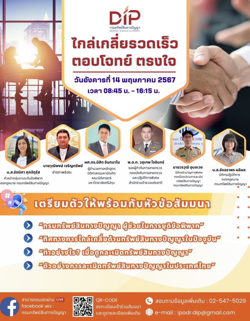รับชมผ่าน Live Facebook : กรมทรัพย์สินทางปัญญา >> https://www.facebook.com/ipthailand ลงทะเบียนเข้าร่วมสัมมนาและอ่านรายละเอียดเพิ่มเติม >> https://linktr.ee/ipodr.dip