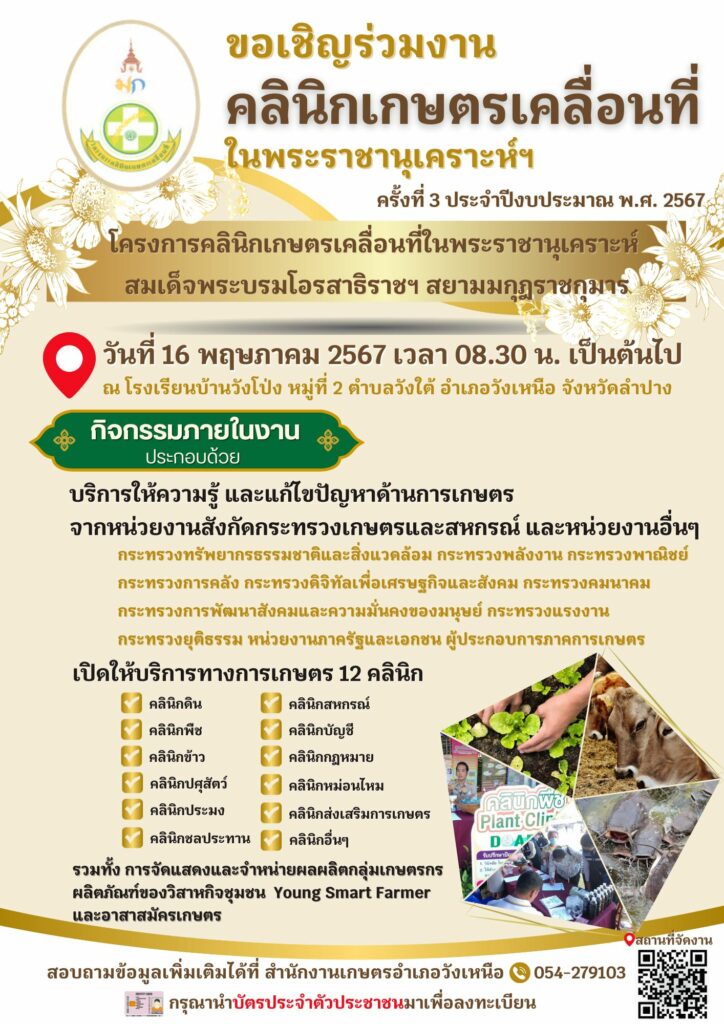 กรมส่งเสริมการเกษตร เชิญร่วมงานคลินิกเกษตรเคลื่อนที่ในพระราชานุเคราะห์ฯ วันที่ 16 พฤษภาคม 2567