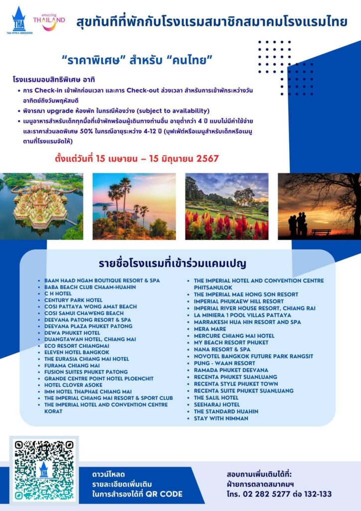 การท่องเที่ยวแห่งประเทศไทย ร่วมกับ สมาคมโรงแรมไทย จัดกิจกรรม “สุขทันที ที่พักกับโรงแรมสมาชิกสมาคมโรงแรมไทย” มอบส่วนลดค่าโรงแรมที่พักแก่นักท่องเที่ยวชาวไทย ตั้งแต่วันที่ 15 เมษายน – 15 มิถุนายน 2567 สิทธิพิเศษ อาทิ