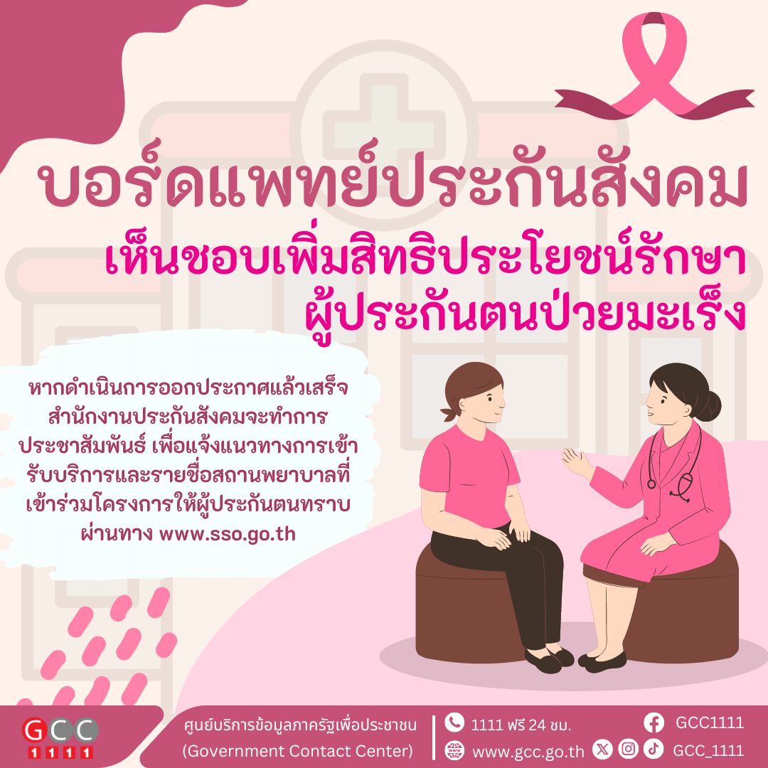 ที่มา : https://www.sso.go.th/wpr/main/news/ข่าวประชาสัมพันธ์_detail_detail_1_16_0/ข่าว-บอร์ดแพทย์ประกันสังคม-เห็นชอบเพิ่มสิทธิประโยชน์รักษาผู้ประกันตนป่วยมะเร็ง-เข้าถึงการรักษาได้อย่างสะดวกและมีประสิทธิภาพ26551_ข่าว%20:%20บอร์ดแพทย์ประกันสังคม%20เห็นชอบเพิ่มสิทธิประโยชน์รักษาผู้ประกันตนป่วยมะเร็ง%20เข้าถึงการรักษาได้อย่างสะดวกและมีประสิทธิภาพ_26551