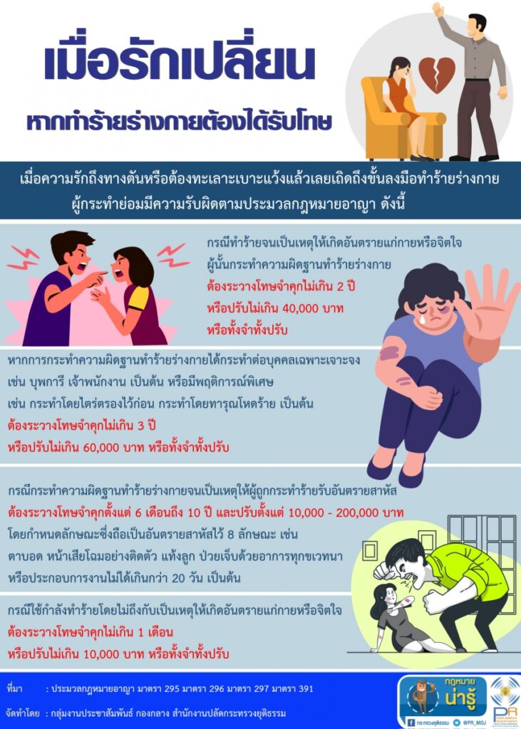 - เมื่อความรักถึงทางตันหรือต้องทะเลาะเบาะแว้งแล้วเลยเถิดถึงขั้นลงมือทำร้ายร่างกาย ผู้กระทำย่อมมีความรับผิดตามประมวลกฎหมายอาญา ดังนี้