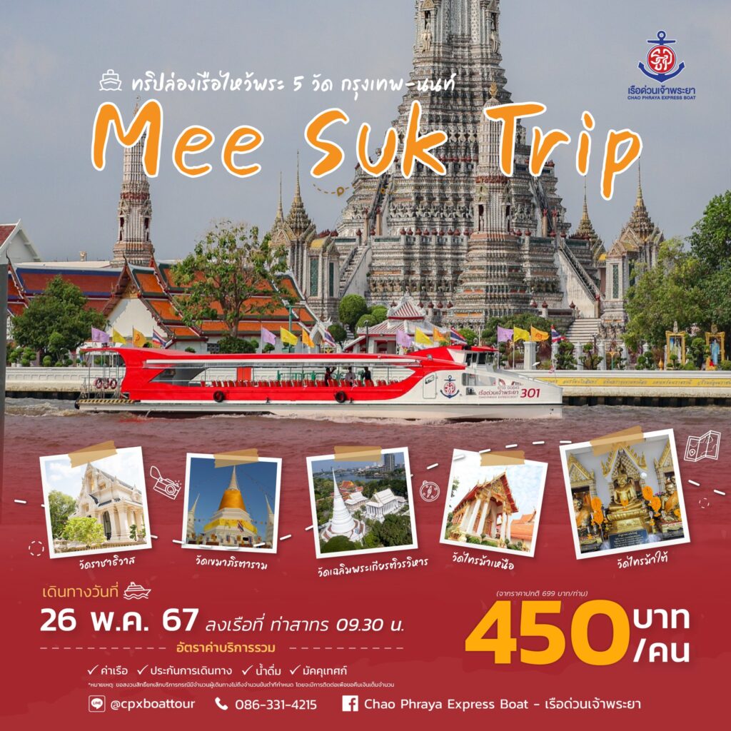 ชวนเชิญทุกท่านมาร่วมทริปสายบุญ ไหว้พระขอพรเสริมสิริมงคลให้กับชีวิตไปด้วยกันกับทริป Mee Suk Trip ด้วยเรือด่วนเจ้าพระยาลำใหม่ (ไม่ปรับอากาศ)