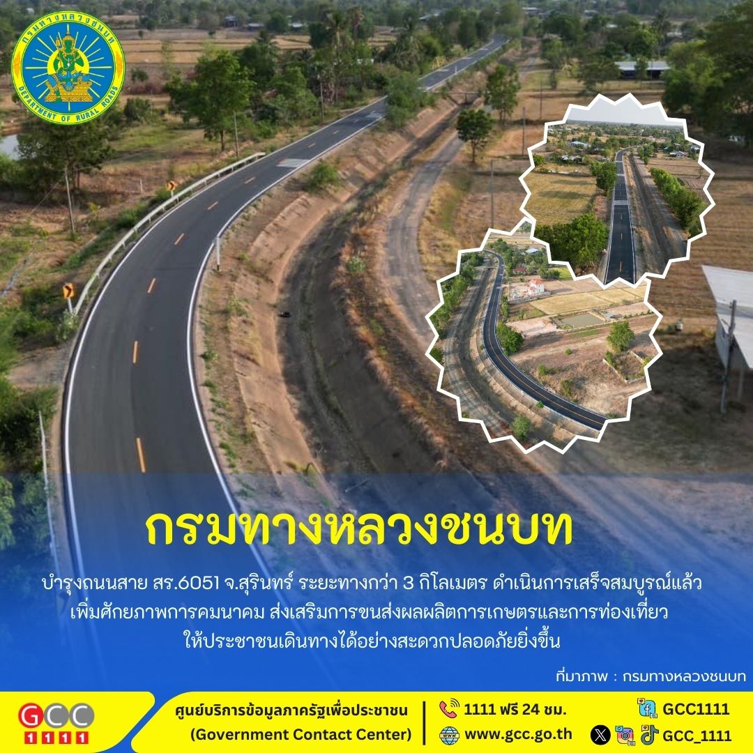 กรมทางหลวงชนบท บำรุงถนนสาย สร.6051 จ.สุรินทร์ ระยะทางกว่า 3 กิโลเมตร ดำเนินการเสร็จสมบูรณ์แล้ว เพิ่มศักยภาพการคมนาคม ส่งเสริมการขนส่งผลผลิตการเกษตรและการท่องเที่ยว ให้ประชาชนเดินทางได้อย่างสะดวกปลอดภัยยิ่งขึ้น