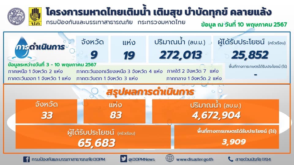กรมป้องกันและบรรเทาสาธารณภัย รายงานผลการดำเนินงานโครงการมหาดไทย เติมน้ำ เติมสุข บำบัดทุกข์ คลายแล้ง ปี 2567 ระหว่างวันที่ 3 – 10 พฤษภาคม 2567 ในพื้นที่ 9 จังหวัด โดยได้สูบส่งน้ำเพื่อช่วยเหลือประชาชนรวมทั้งสิ้นกว่า 272,013 ลูกบาศก์เมตร และช่วยบรรเทาความเดือดร้อนแก่ประชาชนกว่า 25,852 ครัวเรือน