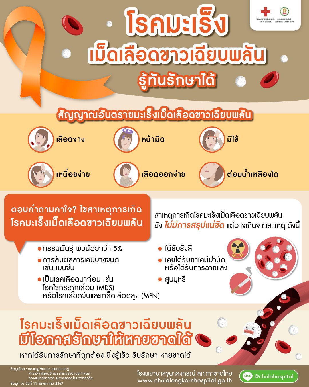 โรงพยาบาลจุฬาลงกรณ์ สภากาชาดไทย เตือนโรคมะเร็งเม็ดเลือดขาวเฉียบพลัน เป็นมะเร็งที่อาจเกิดจากกรรมพันธุ์ การสัมผัสสารเคมีบางชนิด เป็นโรคเลือดมาก่อน การสูบบุหรี่หรือสาเหตุอื่น ๆ