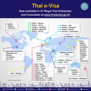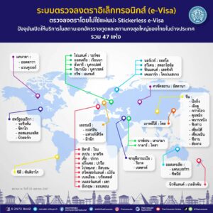 กรมการกงสุล กระทรวงการต่างประเทศ ได้เปิดให้บริการระบบตรวจลงตราอิเล็กทรอนิกส์ (e-Visa) ณ สถานเอกอัครราชทูตและสถานกงสุลใหญ่ไทยในต่างประเทศ รวม 47 แห่ง
