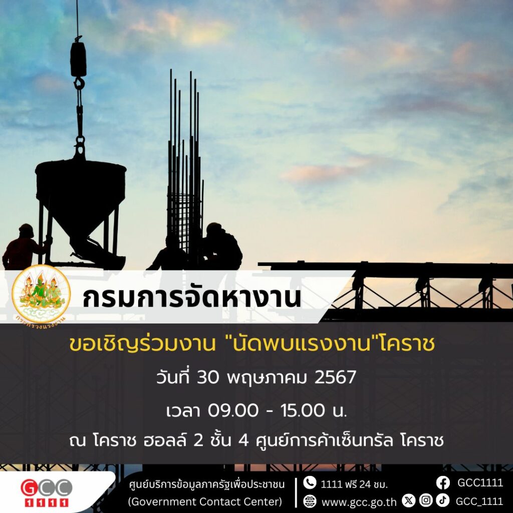 กรมการจัดหางาน สำนักงานจัดหางานจังหวัดนครราชสีมา ขอเชิญร่วมงาน “นัดพบแรงงาน”โคราช ในวันที่ 30 พ.ค.67
