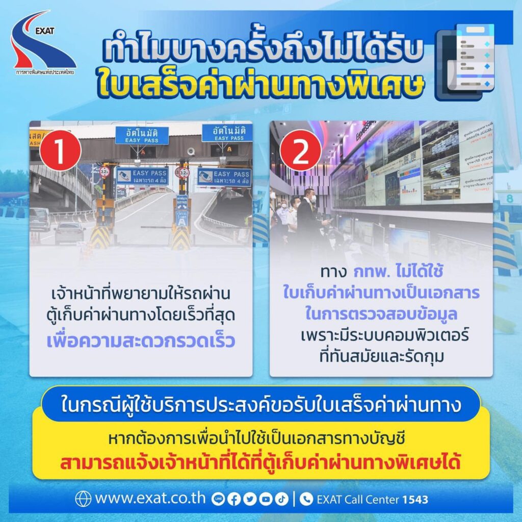 - การทางพิเศษแห่งประเทศไทย ชี้แจงทำไมบางครั้งถึงไม่ได้รับใบเสร็จเมื่อจ่ายค่าผ่านทางพิเศษ