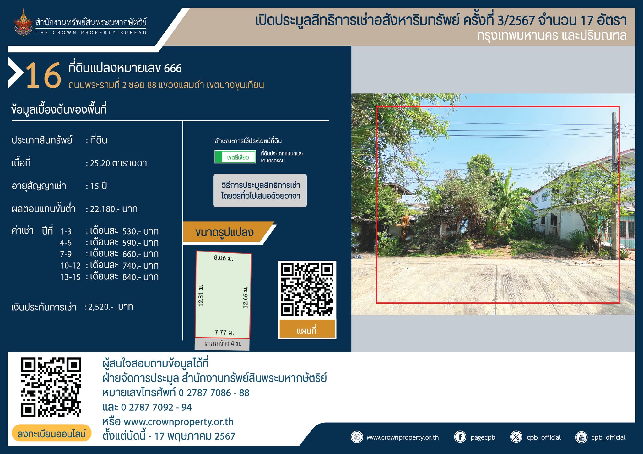 สำนักงานทรัพย์สินพระมหากษัตริย์ เปิดประมูลสิทธิการเช่าอสังหาริมทรัพย์ เขตบางขุนเทียน ที่ดินแปลง 666