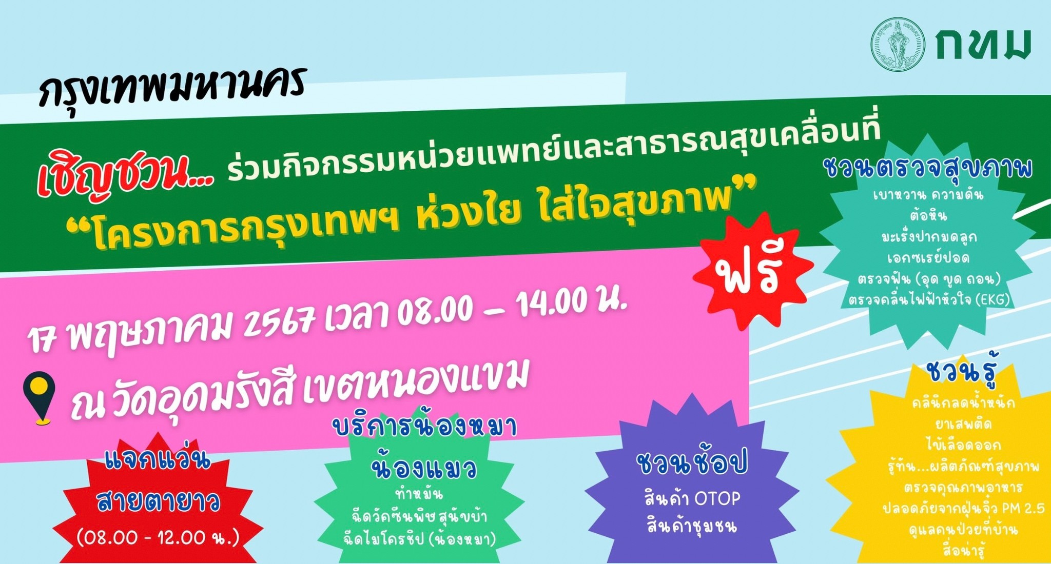 สำนักอนามัย กรุงเทพมหานคร จัดกิจกรรมหน่วยแพทย์และสาธารณสุขเคลื่อนที่ วันที่ 17 พฤษภาคม 2567 ตั้งแต่เวลา 08.00 – 14.00 น. ณ วัดอุดมรังสี เขตหนองแขม