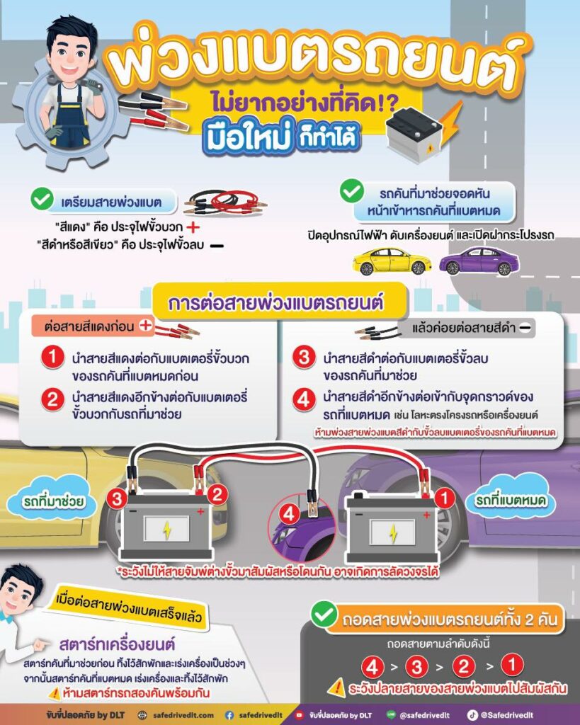 กรมการขนส่งทางบก แนะนำวีธีการพ่วงแบตรถยนต์อย่างถูกวิธีและปลอดภัย