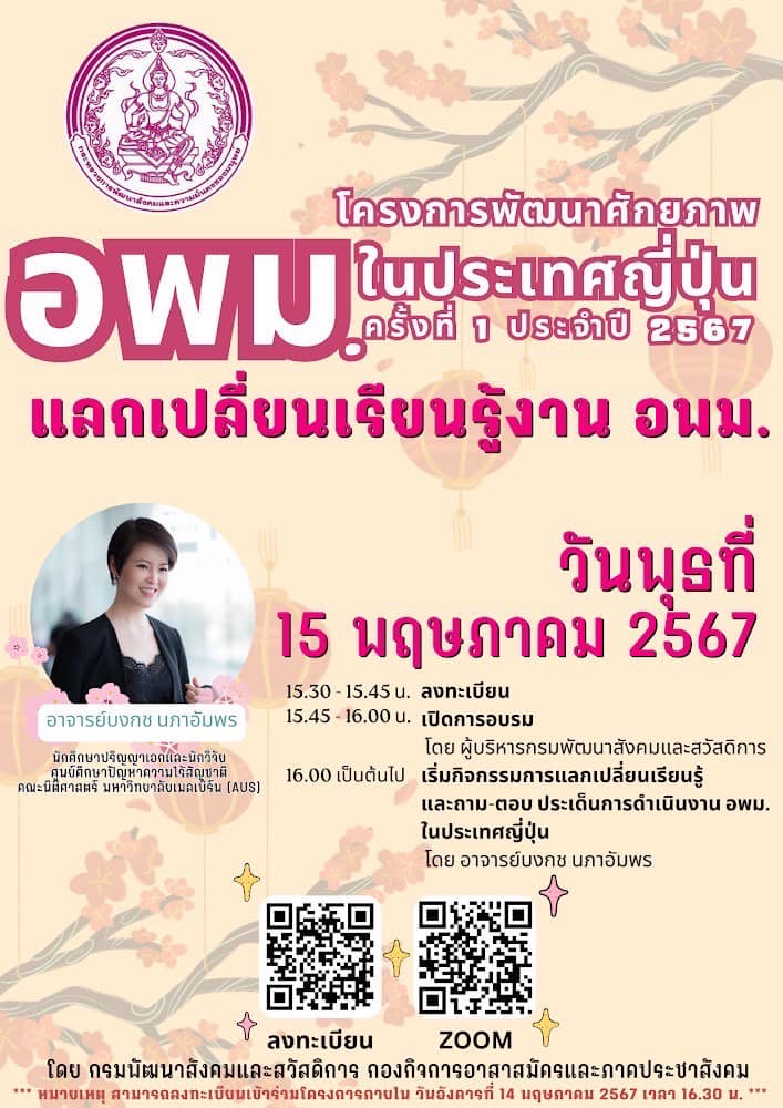 กรมพัฒนาสังคมและสวัสดิการ จัดโครงการพัฒนาศักยภาพ อพม. ในประเทศญี่ปุ่น JP ครั้งที่1/2567 ในวันที่ 15 พฤษภาคม 2567 เวลา 16.00 น. เป็นต้นไป (เวลาตามประเทศไทย) สามารถรับชมผ่าน Zoom Meeting ผู้ที่สนใจสามารถลงทะเบียนได้ตั้งแต่วันที่ 14 พฤษภาคม 2567 ที่ QR Code หรือลิงค์ https://shorturl.asia/KpVzU