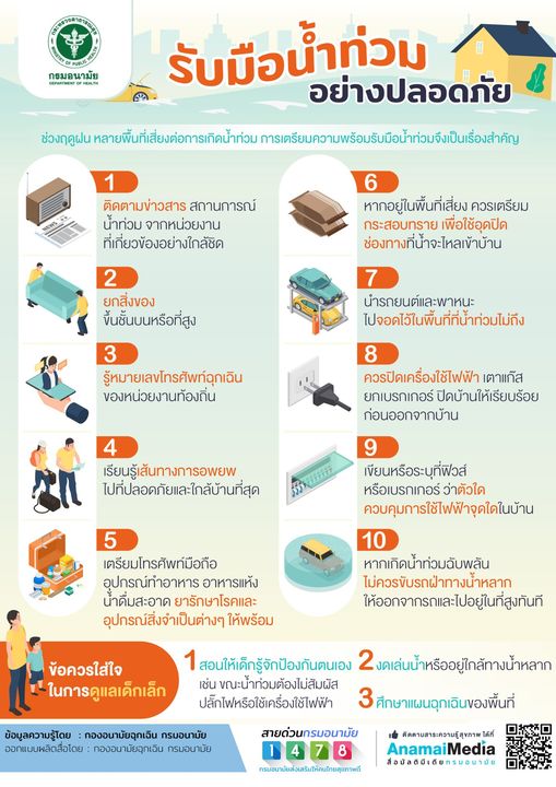 กรมอนามัย เปิดเผยหลายพื้นที่เสี่ยงต่อการเกิดน้ำท่วม การเตรียมความพร้อมรับมือน้ำท่วมจึงเป็นเรื่องสำคัญ จึงขอแนะนำ 10 วิธีการรับมือ “น้ำท่วม” อย่างปลอดภัย