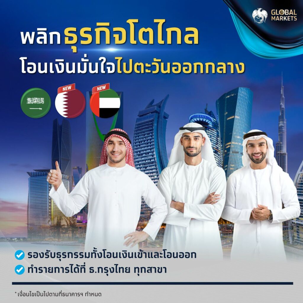 ธนาคารกรุงไทย จำกัด (มหาชน) พร้อมให้บริการแล้ว 3 สกุลเงิน ใน 3 ประเทศ ได้แก่ ซาอุดิอาราเบียริยัล (SAR) กาตาร์ริยัล (QAR) และ สหรัฐอาหรับเอมิเรตส์ดีแรห์ม (AED) ซึ่งสามารถทำรายการได้ที่ ธนาคารกรุงไทย ทุกสาขา Krungthai Corporate Online Krungthai Trade Online และ Krungthai BUSINESS (เฉพาะสกุลเงิน SAR และ AED) สำหรับสกุลเงิน QAR สามารถทำรายการผ่านช่องทางสาขาธนาคารกรุงไทย และ Krungthai Trade Online *โปรดศึกษาข้อมูลและข้อจำกัดของแต่ละสกุลเงิน สนใจคลิก https://krungthai.com/link/middle-east-transfer-fb สอบถามเพิ่มเติม Krungthai Contact Center 02-111-1111