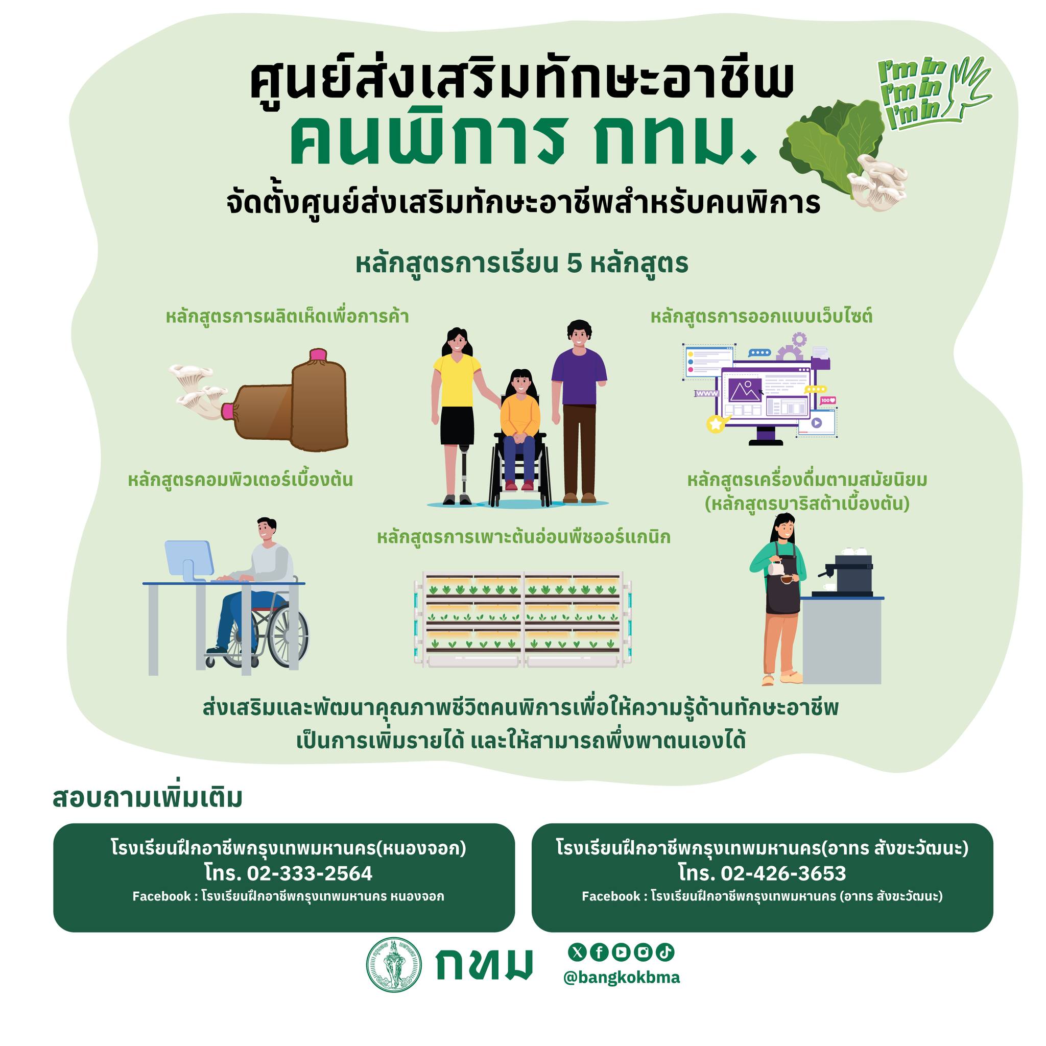 ศูนย์ส่งเสริมทักษะอาชีพคนพิการ กทม. จัดตั้งศูนย์ส่งเสริมทักษะอาชีพสำหรับคนพิการ ด้วยหลักสูตรการเรียน 5 หลักสูตร เพื่อส่งเสริมและพัฒนาคุณภาพชีวิตคนพิการเพื่อให้ความรู้ด้านทักษะอาชีพเป็นการเพิ่มรายได้ และสามารถพึ่งพาตนเองได้