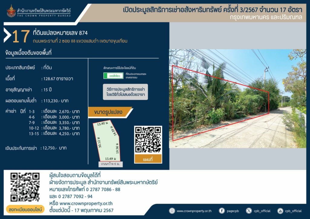 สำนักงานทรัพย์สินพระมหากษัตริย์ เปิดประมูลสิทธิการเช่าอสังหาริมทรัพย์ เขตบางขุนเทียน ที่ดินแปลง 874