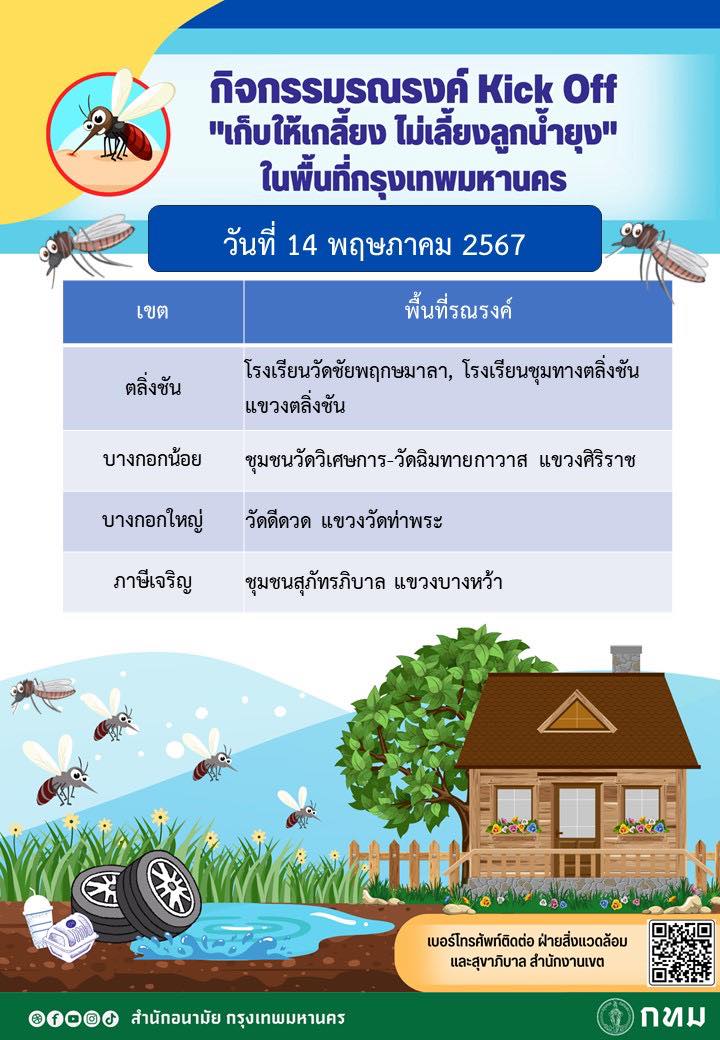 สำนักอนามัย กรุงเทพมหานคร จัดกิจกรรมรณรงค์ Kick Off เก็บให้เกลี้ยง ไม่เลี้ยงลูกน้ำยุง ในพื้นที่กรุงเทพมหานคร ประจำวันที่ 14 พฤษภาคม 2567