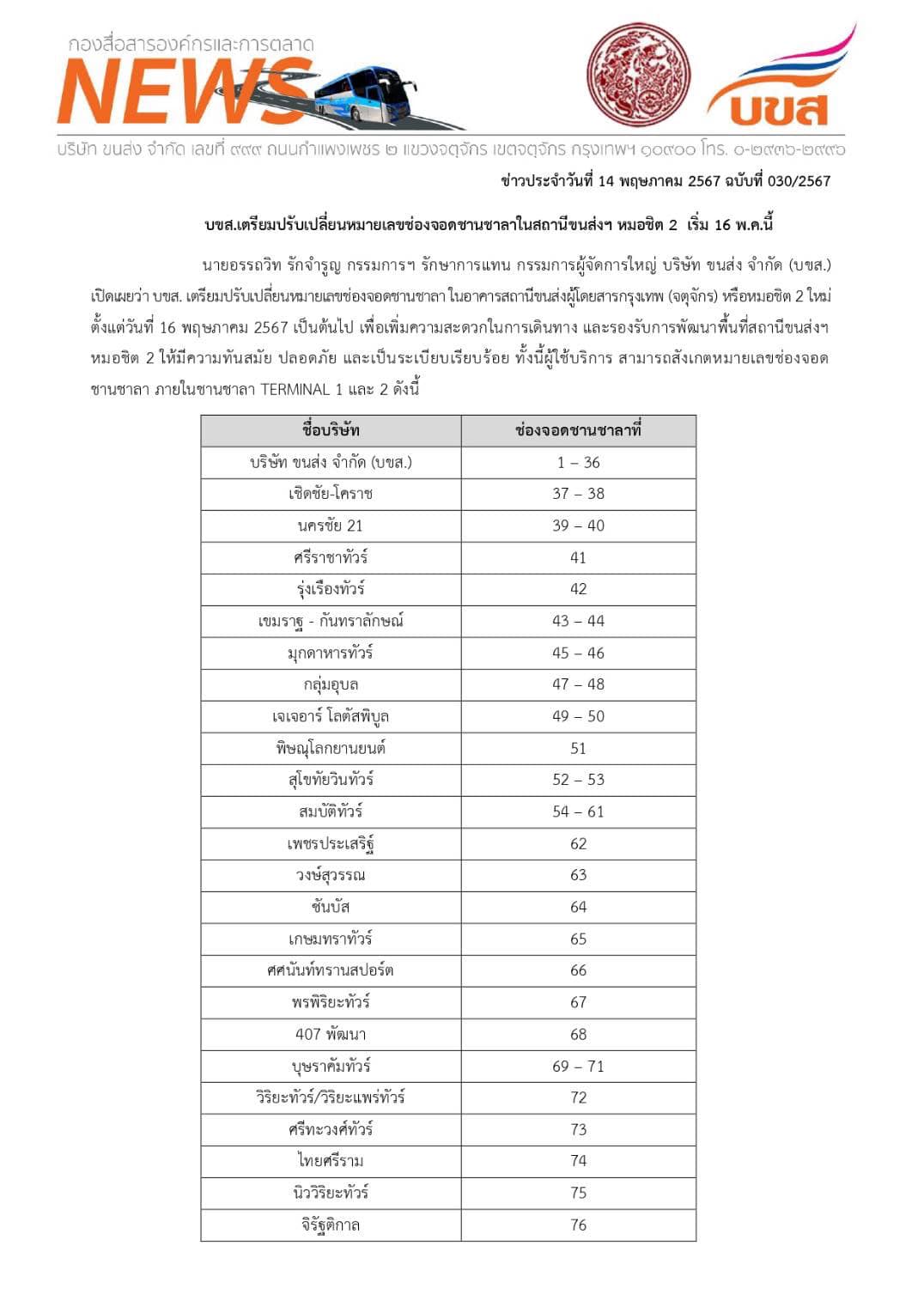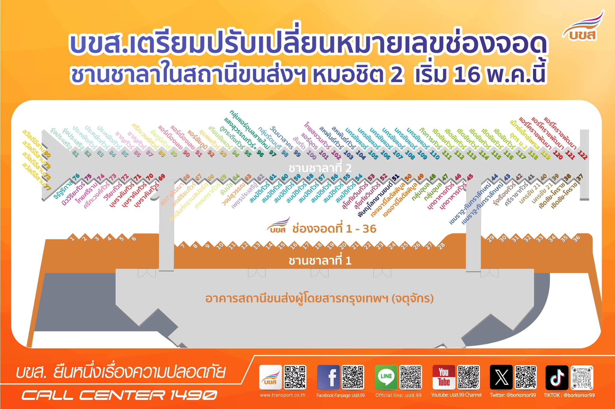 บขส. เตรียมปรับเปลี่ยนหมายเลขช่องจอดชานชาลาในสถานีขนส่งฯ หมอชิต 2 เริ่ม 16 พ.ค. 67