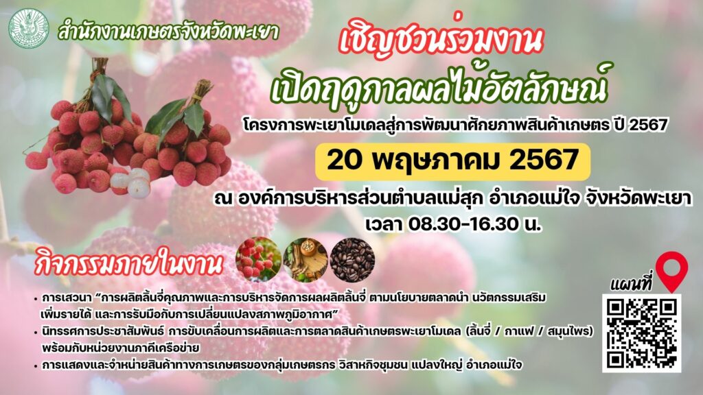สำนักงานเกษตรจังหวัดพะเยา เชิญร่วมงาน “เปิดฤดูกาลผลไม้อัตลักษณ์ ” วันที่ 20 พฤษภาคม 2567