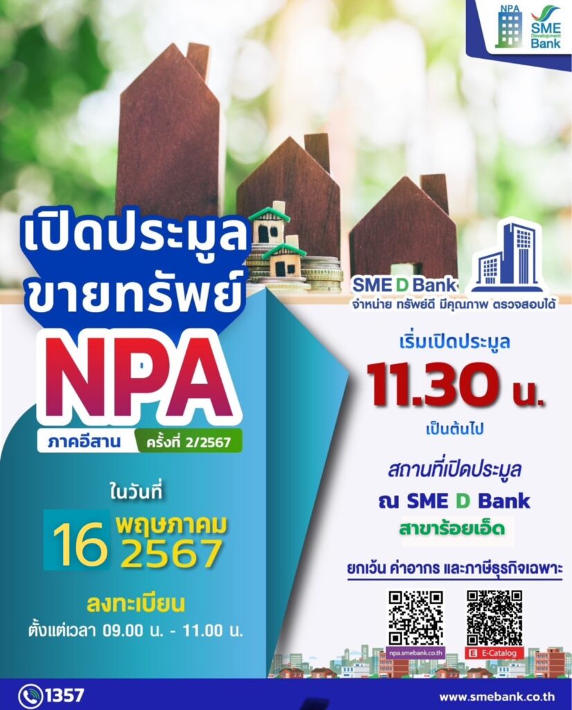 ธนาคารพัฒนาวิสาหกิจขนาดกลางและขนาดย่อมแห่งประเทศไทย จัดงานประมูลขายทรัพย์ NPA ภาคอีสาน ครั้งที่ 2/2567 วันที่ 16 พฤษภาคม 2567 ลงทะเบียนเวลา 09.00 – 11.00 น. เริ่มประมูล 11.30 น. เป็นต้นไป ณ SME Bank ณ สาขาร้อยเอ็ด ยกเว้น ค่าอากร และค่าภาษีธุรกิจเฉพาะ ดูข้อมูลเพิ่มเติมได้ที่ https://npa.smebank.co.th/v2/index.php สามารถสอบถามรายละเอียดเพิ่มเติมได้ที่ Call Center 1357 เว็บไซต์ : http://www.smebank.co.th