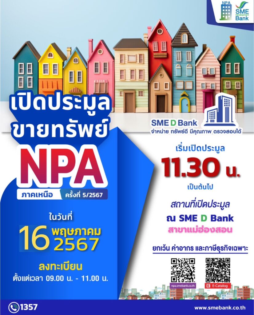 ธนาคารพัฒนาวิสาหกิจขนาดกลางและขนาดย่อมแห่งประเทศไทย จัดงานประมูลขายทรัพย์ NPA ภาคเหนือ ครั้งที่ 5/2567 วันที่ 16 พฤษภาคม 2567 ลงทะเบียนเวลา 09.00 – 11.00 น. เริ่มประมูล 11.30 น. เป็นต้นไป ณ SME Bank ณ สาขาแม่ฮ่องสอน ยกเว้น ค่าอากร และค่าภาษีธุรกิจเฉพาะ ดูข้อมูลเพิ่มเติมได้ที่ https://npa.smebank.co.th/v2/index.php สามารถสอบถามรายละเอียดเพิ่มเติมได้ที่ Call Center 1357 เว็บไซต์ : http://www.smebank.co.th