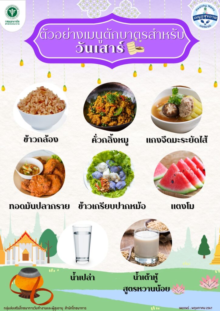 กรมอนามัย อยากชวนมาตักบาตรเสริมบุญ สร้างสุขภาพแด่พระสงฆ์ ด้วยเมนูชูสุขภาพ กับ ตัวอย่างเมนูตักบาตรสำหรับวันเสาร์ หากทำอาหารด้วยเอง เลือกวัตถุดิบ สด สะอาด และ อย่าลืมเสริมด้วยการคุมปริมาณโซเดียม ลด หวาน มัน เค็มด้วย หากซื้อถวาย เลือกที่สดสะอาด ปรุงสุกสดใหม่ เพื่อสุขภาพที่ดีของพระสงฆ์ เพราะพระสงฆ์เลือกเมนูถวายไม่ได้